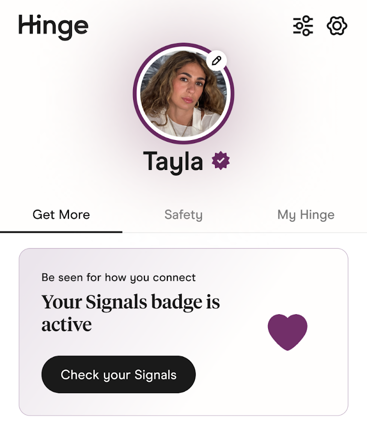 Når en daters Signals-badge er aktiv, betyder det, at deres nylige aktivitet på Hinge afspejler gennemført deltagelse og opfølgning, og at deres profil opfylder de grundlæggende krav for funktionen.