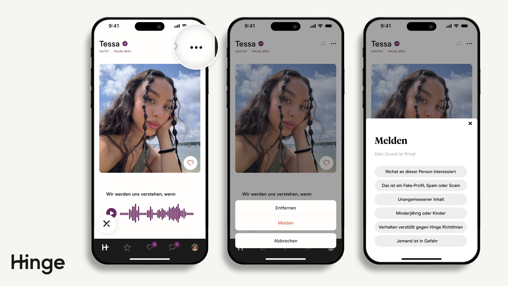 Deine Sicherheit hat für uns oberste Priorität. Wenn du eine besorgniserregende Erfahrung auf Hinge gemacht hast, ermut zu melden, damit wir Maßnahmen ergreifen können.