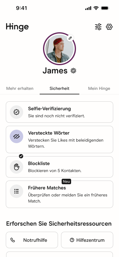 Du findest deine Liste der vergangenen Matches im Sicherheitscenter, indem du auf dein Foto-Icon und dann auf den Tab Sicherheit im Profil-Hub tippst.