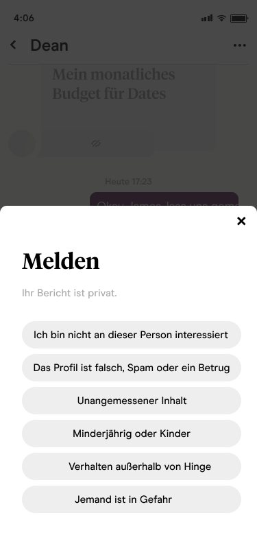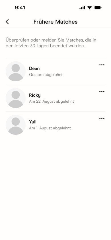 Bitte beachte: Das Melden einer Person entfernt dich nicht aus der Liste der vergangenen Matches dieser Person.