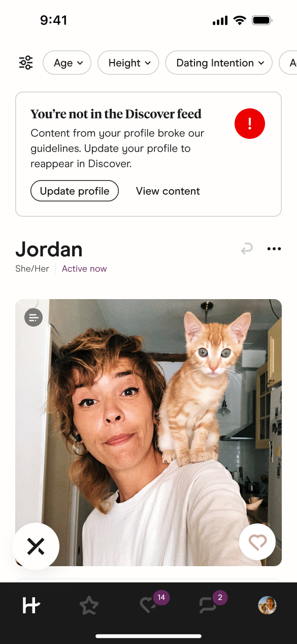 Our goal is to give daters clear guidance that will help them efficiently update their content so they can continue matching. That’s why you’ll be notified if content is removed, and we’ll explain why.