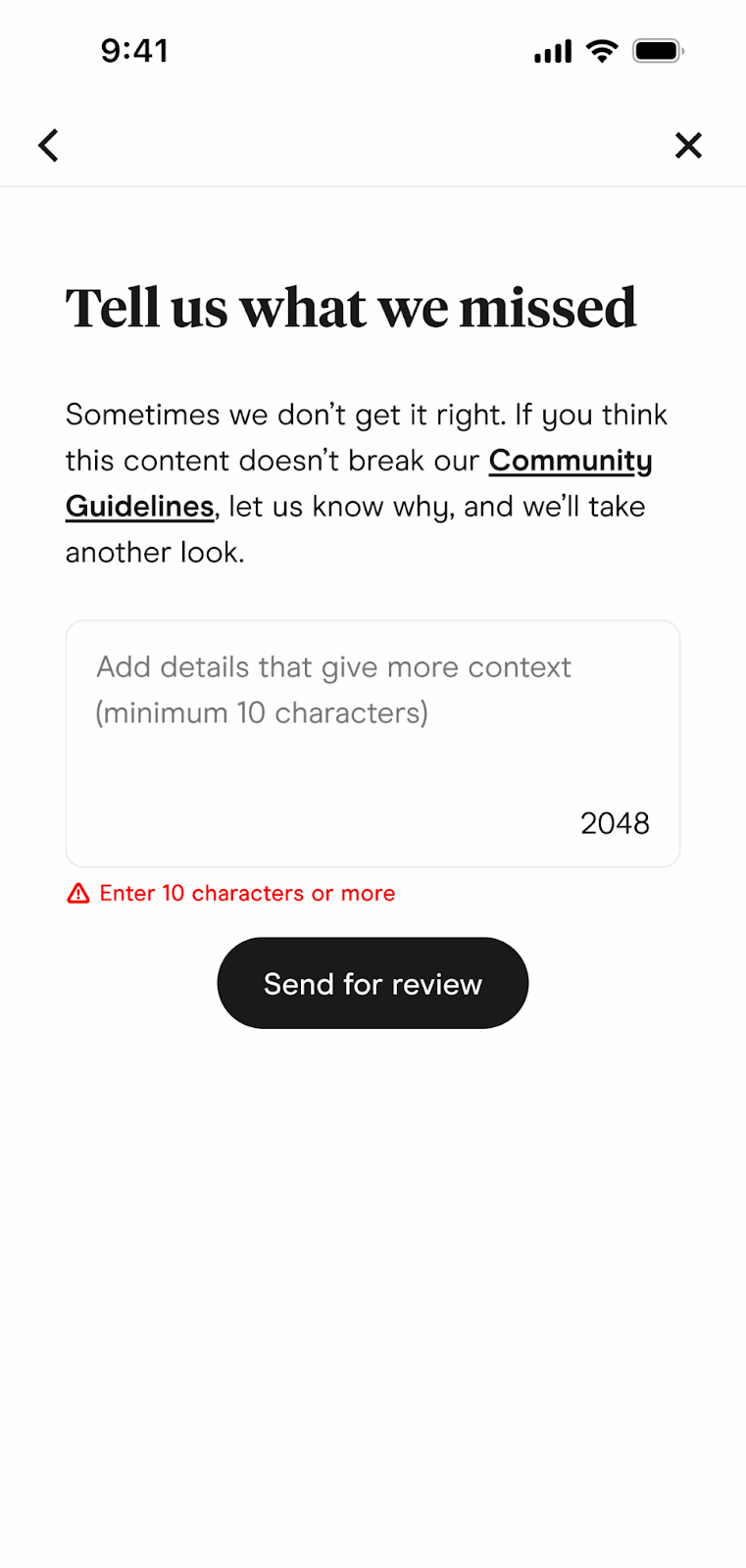If you believe a photo, video, or prompt that was removed did not violate our Community Guidelines, you may be able to ask us to review the decision directly in the app.
