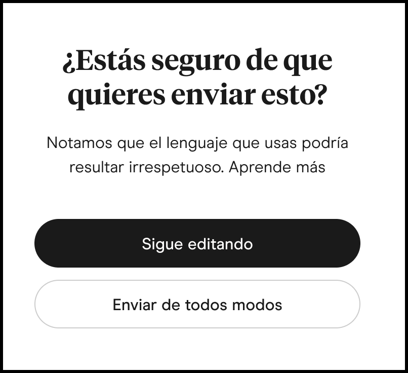 Are You Sure? es una función que fomenta conversaciones reflexivas y respetuosas. Antes de enviar un mensaje, esta función ofrece una breve verificación para ayudar a prevenir malentendidos.