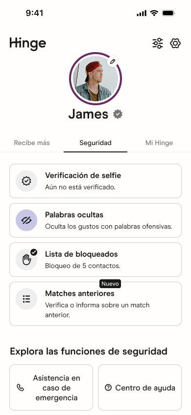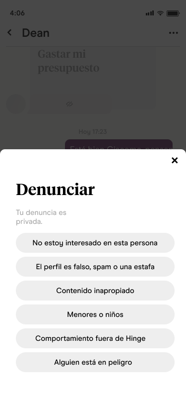 Para más información sobre el comportamiento que esperamos de los usuarios para mantener Hinge como un lugar positivo, consulta nuestras Normas de la Comunidad.