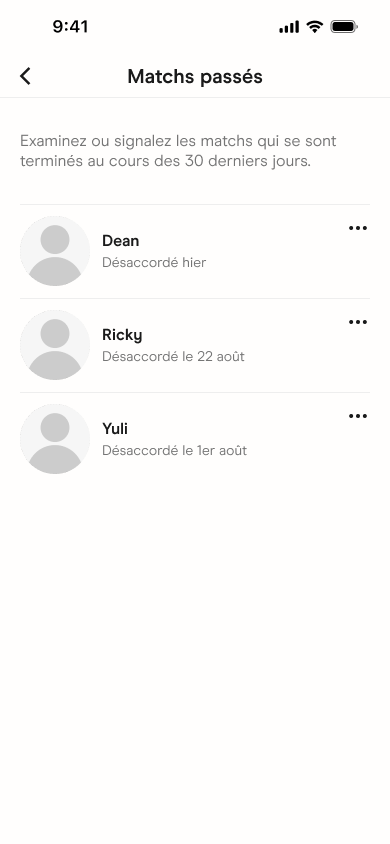 Votre liste d’anciens matchs inclut les profils des utilisateurs avec qui vous vous êtes désapparié ou qui se sont désappariés de vous au cours des 30 derniers jours. Vous pouvez utiliser cette liste pour signaler le compte de quelqu’un qui vous a mis mal à l’aise, inquiété, ou qui a enfreint nos Règles de la communauté.