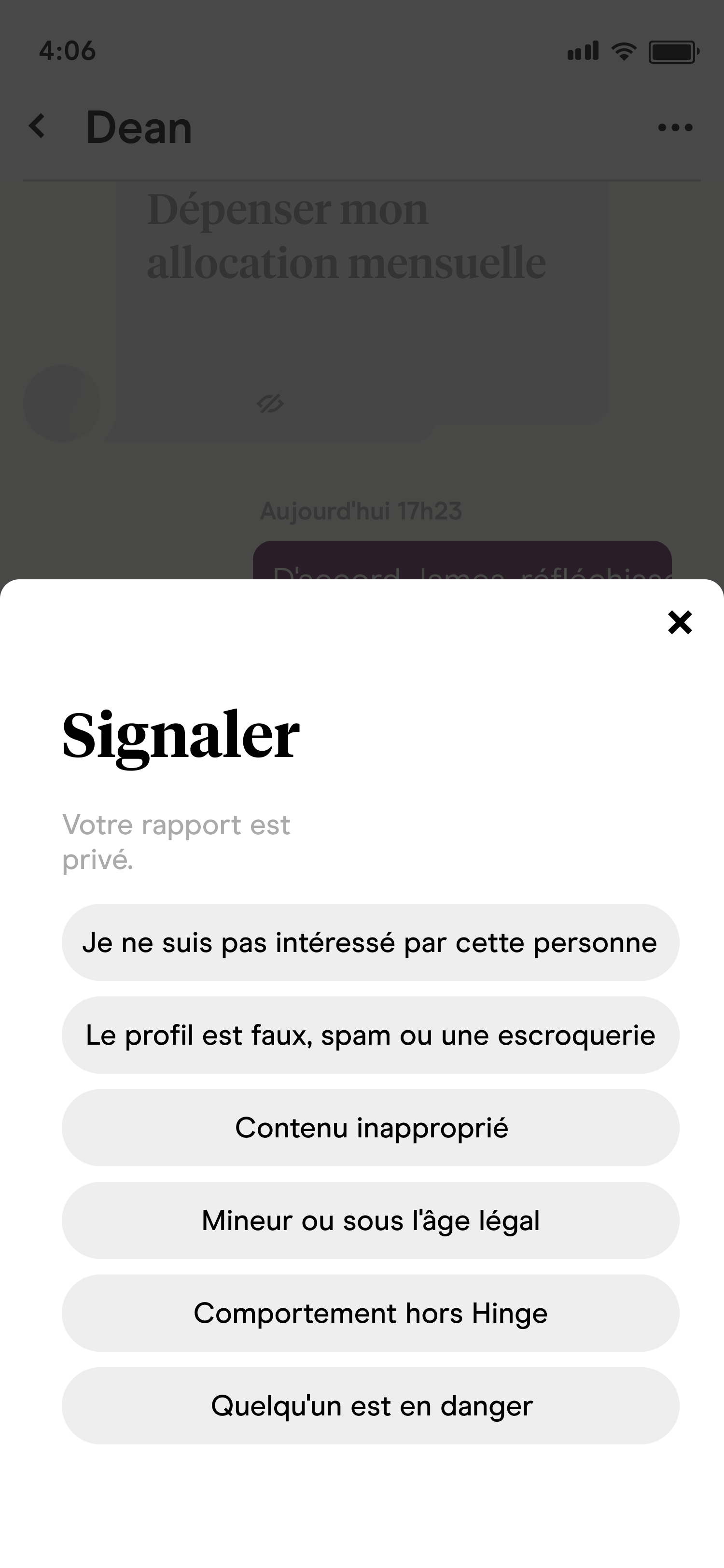 Si vous souhaitez faire un signalement concernant le profil de quelqu’un avec qui vous n’êtes plus apparié sur Hinge, vous pouvez le faire en accédant à votre liste d’anciens matchs. La sécurité de nos utilisateurs est une priorité absolue, et nous souhaitons être informés de tout comportement pouvant aller à l’encontre de nos Conditions, que ce soit dans l’application ou lors d’un rendez-vous.