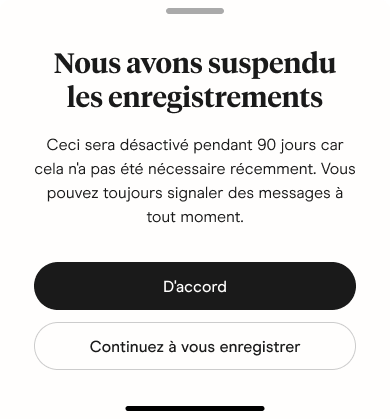 Ce contrôle a pour but de vous donner un moment pour réfléchir et nous faire savoir comment un message a pu vous faire sentir. C’est une façon de vous exprimer sur quelque chose que vous n’avez peut-être pas aimé, mais que vous ne jugez pas nécessaire de signaler.