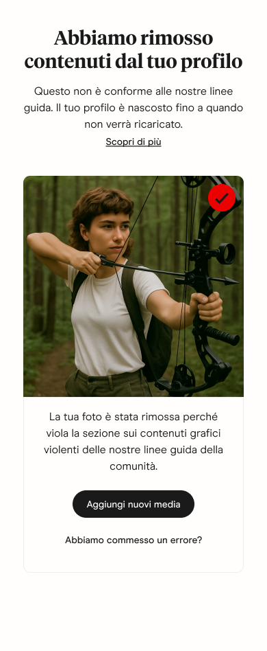 Se un contenuto viene rimosso dal tuo profilo, potresti doverlo aggiornare per assicurarti che soddisfi nuovamente i requisiti prima di feed Scopri o In Evidenza. Potrai comunque visualizzare i tuoi match, inviare e ricevere messaggi e vedere i like in arrivo.