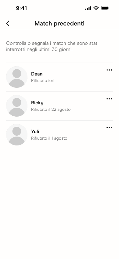 lista Match Precedenti include i profili degli utenti con cui ti sei tolto il match o che si sono tolti il match con te negli ultimi 30 giorni. Puoi usare questa lista per segnalare l’account di qualcuno che ti ha fatto sentire preoccupato, a disagio, o che ha comunque violato le nostre Linee Guida della Community.