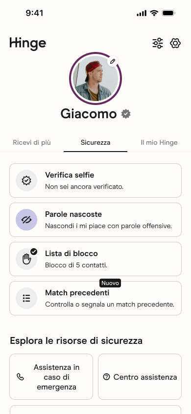 Puoi trovare la tua lista Match Precedenti nel Centro Sicurezza, toccando la tua Icona Foto e la scheda Sicurezza nell’Hub del Profilo.