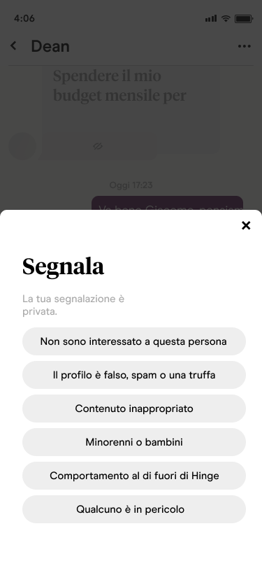Se desideri segnalare il profilo di qualcuno con cui non hai più il match su Hinge, puoi farlo individuando la tua lista Match Precedenti. La sicurezza dei nostri utenti è una priorità assoluta e vogliamo essere informati su comportamenti che potrebbero violare i nostri Termini, sia all’interno dell’app che durante un appuntamento.