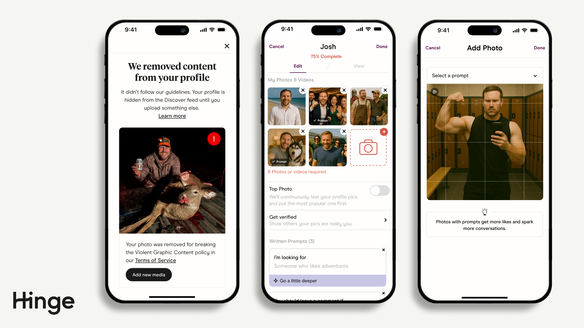 Soms schendt een bepaald stuk content onze Communityrichtlijnen, zelfs als de rest van je profiel dat niet doet. Hinge kan een specifieke foto, video of prompt verwijderen die onze Servicevoorwaarden schendt, zonder het account volledig te verwijderen.