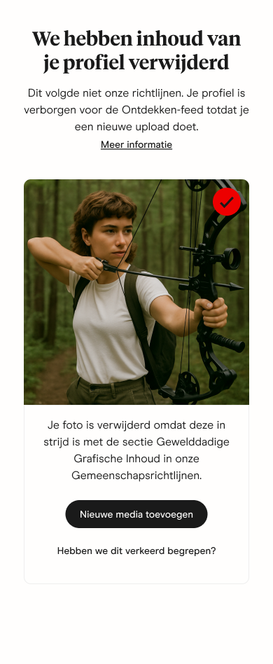 Ons doel is om daters duidelijke richtlijnen te geven die hen helpen hun content efficiënt bij te werken, zodat ze kunnen blijven matchen. Daarom krijg je een melding als content wordt verwijderd, en leggen we uit waarom.