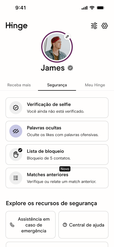Você pode encontrar sua lista de Matches Anteriores no Centro de Segurança, tocando no seu Ícone de Foto e na aba Segurança no Hub de Perfil.