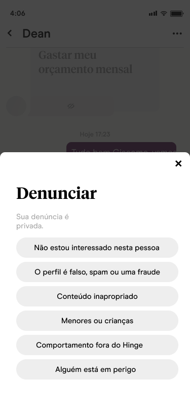 Para mais informações sobre o comportamento que esperamos dos usuários para manter o Hinge um lugar positivo, consulte nossas Diretrizes da Comunidade.