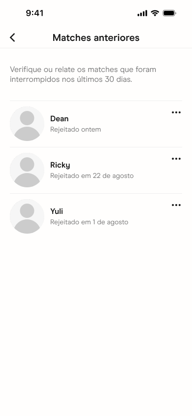 Sua lista de Matches Anteriores inclui os perfis de pessoas com quem você desfez o match ou que desfizeram o match com você. Você pode usar essa lista para denunciar a conta de alguém que fez você se sentir preocupado(a), desconfortável ou que de alguma forma violou nossas Diretrizes da Comunidade.