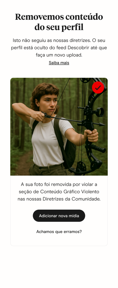 Nosso objetivo é dar orientações claras aos usuários que os ajudem a atualizar rapidamente seu conteúdo para que possam continuar dando matches. Por isso, você será notificado se algum conteúdo for removido, e explicaremos o motivo.