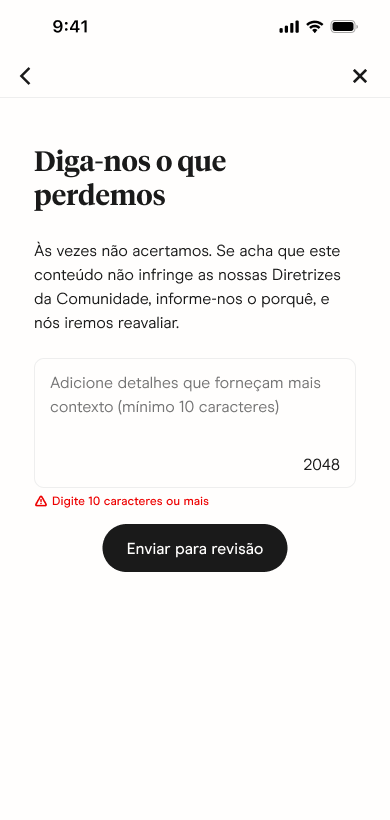 Você pode contestar a remoção de Fotos, Prompts de Texto, Enquetes de Prompt, ou Prompts de Voz. Os recursos se aplicam a partes individuais do conteúdo, então se mais de um item for sinalizado, você pode concordar com algumas decisões e solicitar revisão de outras.