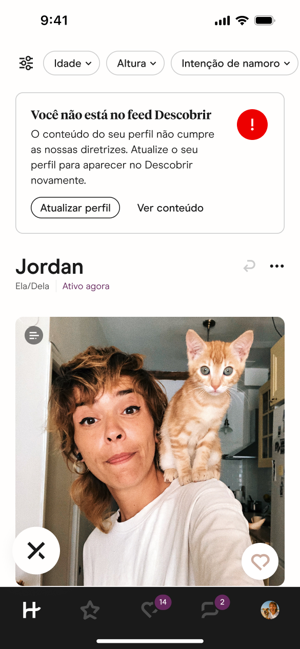 Se o conteúdo for removido do seu perfil, pode ser necessário atualizá-lo para garantir que atenda aos requisitos novamente antes que você possa reaparecer no feed Descobrir ou Destaques. Você ainda poderá ver seus matches, enviar e receber mensagens e visualizar seus likes recebidos.